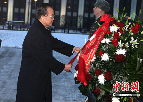 11月23日,正在俄罗斯圣彼得堡访问的中国总理温家宝向列宁格勒保卫者纪念碑敬献花篮。中新社记者 周兆军 摄