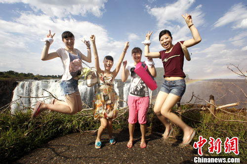 当地时间11月23日,一场暴雨后,4名中国美女游客在维多利亚瀑布前欢呼雀跃。近年来,除了传统的欧美游客外,越来越多的中国游客前往非洲旅游。维多利亚瀑布位于非洲赞比西河中游,赞比亚与津巴布韦接壤处,宽1,700多米、最高落差108米,1989年被列入《世界遗产目录》。