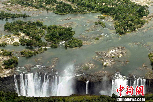 当地时间11月23日下午,一场暴雨后,从空中俯瞰碧绿簇拥着的维多利亚瀑布气势磅礴。 中新社记者 任晨鸣 摄
