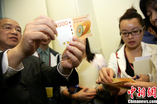 11月24日,香港金融管理局向记者率先展示新版港元。金管局联同三间发钞银行,将于12月7日,推出新系列的1000港元钞票。新钞票加入多项防伪特征,包括动感变色图案,其余面额的新设计钞票,亦会在明年起分批推出。