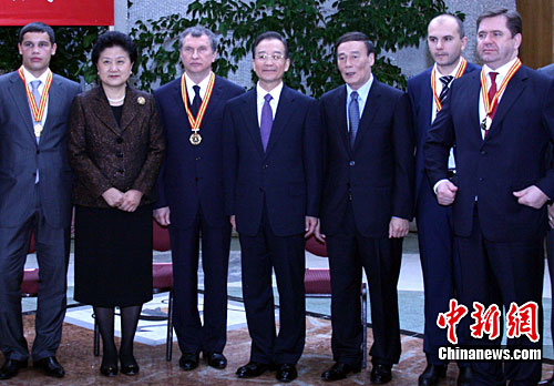 11月24日,中国总理温家宝在莫斯科向为中俄能源和汉语教学、传播做出突出贡献的俄方人士颁奖。图为温家宝、王岐山、刘延东与获奖者合影。中新社记者 周兆军 摄