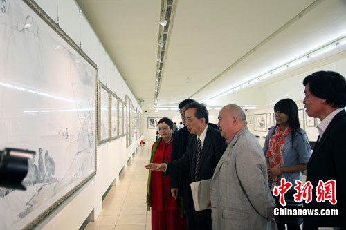 11月24日,南开大学尹沧海教授(右三)台北书画艺术展,在台北国父纪念馆举办媒体鉴赏会,尹教授的书画以纯净优雅的中国文人画气质打动了当地艺术家。中新社记者 关向东 摄