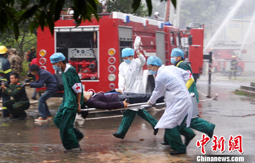 11月25日,由广西壮族自治区消防、治安、医疗等多部门组成的专业人防队伍,先后在南宁、柳州、桂林、防城港、玉林、贵港、梧州 、北海8个城市开展战时防空防灾应急救援演练。此次演练以信息化条件下防空袭斗争和公共突发事件应急救援为背景展开,进一步锻炼和提高人防机关应急行动组织指挥能力。图为在北海分会场模拟的大厦火灾现场,医护人员用担架将被困人员抬出抢救。