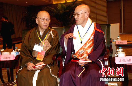 日本东大寺鉴真坐像23日回到家乡,供奉在扬州大明寺鉴真图书馆,26日举行鉴真坐像揭幕仪式,供市民和信众瞻仰。这是继30年前日本奈良唐招提寺鉴真干漆像首次返乡“探亲”后第二次回到家乡。这尊大师坐像与鉴真干漆像同为日本国家级文物,距今已有267年的历史,一直供奉在东大寺大佛殿西侧戒坛院千手堂。图为日本壬生寺主持(前唐招提寺长老)松浦俊海(左)、日本东大寺管长北河原公敬(右)在交谈。中新网发 崔佳明 摄
