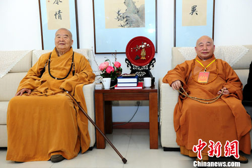 11月26日上午,日本奈良县东大寺保存的国宝级藏物——鉴真大和尚坐像回扬省亲活动在江苏省扬州市举行。中国佛教协会会长传印法师(右)与台湾佛光山星云法师等高僧共同出席了该活动。