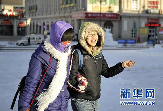 11月25日,两位呼伦贝尔境内满洲里市的市民穿着厚厚的棉衣走在严寒的街头上。李欣 摄