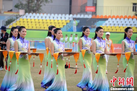 孟加拉板球队26日在决赛中以119比118的比分险胜阿富汗队夺得金牌,图为颁奖礼上漂亮的礼仪小姐。中新社记者 唐贵江 摄