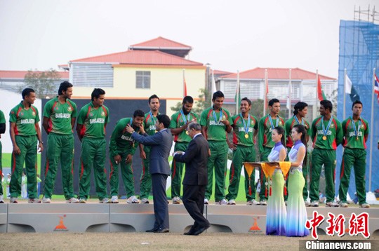 孟加拉板球队11月26日在决赛中以119比118的比分险胜阿富汗队,夺得孟加拉在本届亚运会上首枚金牌。图为孟加拉队的颁奖现场。中新社记者 唐贵江 摄