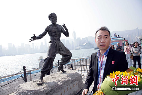 香港李小龙会会长黄耀强带领一批会员到星光大道李小龙铜像前献花。中新社发 洪少葵 摄