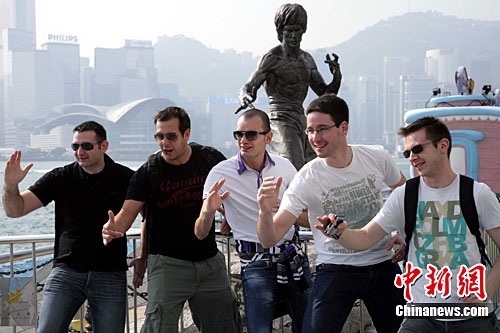 一批游客在香港星光大道李小龙铜像前摆出李小龙招牌功夫手势。中新社发 洪少葵 摄