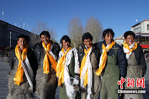 27日清晨,来自林芝波密县的一个朝圣团体抵达拉萨大昭寺,完成了他们的朝圣心愿。中新社记者 徐长安 摄