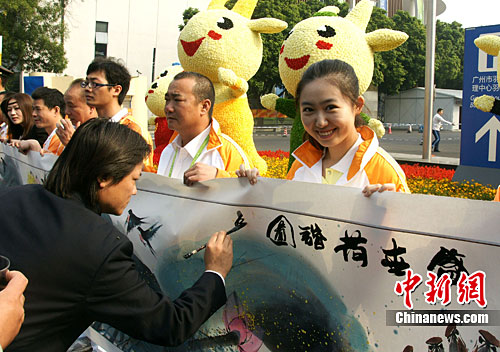 11月27日,在亚运会胜利闭幕之际,亚运组委会迎来一份特殊的礼物——长达16米的水墨荷花长卷“盛世荷谐”。该画由中国著名画荷名家陆万运精心创作,16米的数字代表着第十六届亚洲运动会。整个画面有展翅欲飞的仙鹤、放声歌唱的燕子、千姿百态的荷花,寓意着广州第十六届亚洲运会成功举办。现场,来自三军仪仗队的官兵以及亚运会志愿者共同将16米盛世荷谐图展开,场面十分壮观。