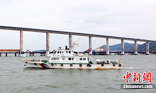 11月29日,福建福州海事海巡艇在平潭海峡大桥桥区巡逻。11月30日平潭岛县连接陆地的平潭海峡大桥将试通车,平潭是离大陆台湾本岛最近的地方,主岛海坛岛为中国第五大岛、福建第一大岛。福州海事局在平潭海峡大桥施工三年期间水陆日夜监管,进行97次临时交通管制,共出动海巡艇378艘次,执法人员1008人次。中新社发 张丽君 摄