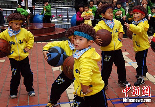 11月29日,福建省直广厦幼儿园的小朋友们在趣味运动会上表演趣味街舞式蓝球。中新社发 张丽君 摄