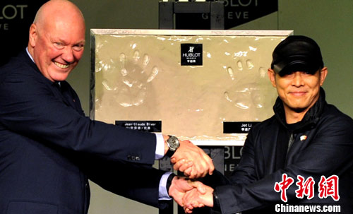 11月29日,全球知名奢侈品集团LVMH旗下的瑞士顶级腕表品牌HUBLOT宇舶表首家北京专卖店在北京王府井步行街举办开幕庆典。宇舶表全球CEO让-克劳德·比弗、国际功夫巨星李连杰作为主礼嘉宾为专卖店开幕剪彩。同时宇舶表宣布,李连杰正式加入宇舶表大家庭,成为继马拉多纳、车王埃尔顿·塞纳家族和塞纳基金、曼联足球队等之后的又一个相伴宇舶表的传奇名字,也是宇舶表首位亚洲品牌大使。图为李连杰签约宇舶表成为首位亚洲品牌大使。