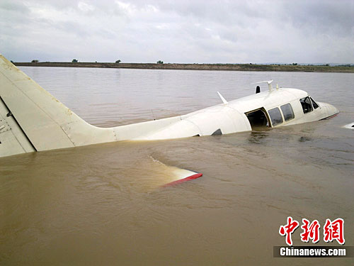 图为在河中迫降的飞机。