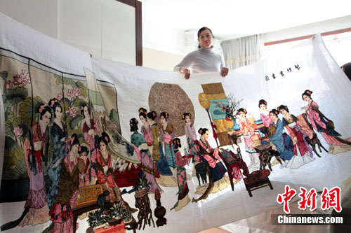 近日,吉林省长春市52岁的李桂华,用了近一年的时间精心绣制了一幅长4米、宽2米的十字绣,名为“琴棋书画”,所绣的18个女子各个栩栩如生、情态各异。这幅十字绣作品,李桂华称开价16万元人民币。中新社发 田伟 摄