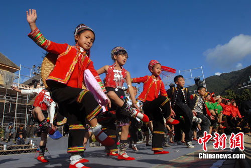 图为哈尼族小朋友载歌载舞庆节日。中新社发 任东 摄