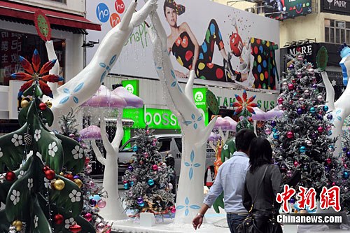 12月1日,一双情侣热络地走过香港世贸中心广场的“雪景”景观。今年12月29日至明年1月2日的冬日节,香港无以计数的商家费尽心机布置赛过北国的“雪景”。中新社记者 郑祚声 摄