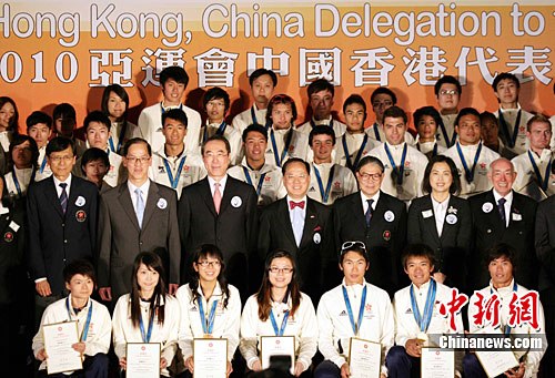 香港亚运代表团在广州亚运会共夺得40面奖牌,其中8面金牌、15面银牌及17面铜牌。12月1日,香港特区政府连同港奥委会在中环遮打花园举行祝捷会,行政长官曾荫权、政务司司长唐英年、民政事务局长曾德成、港协暨奥委会会长霍震霆等主礼,并向运动员颁发表扬状,嘉许他们出色表现。中新社发 洪少葵 摄