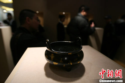 12月2日,观众在匡时秋拍预展中观赏“崇祯壬午东年月青来监造”冲天耳金片三足炉。据考,此炉曾为《古玩指南》作者赵汝珍旧藏,相玩互语中以此炉相赠与王世襄先生。不出意料,铜炉拍卖的价格记录将会在这个专场中被打破。