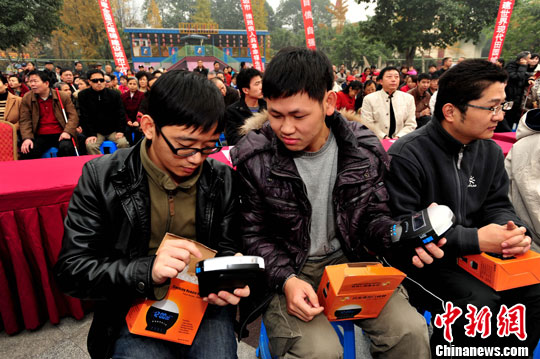 12月3日是第十九个国际残疾人日。成都市举行以“建设无障碍城市 享舒适顺畅生活”为主题的“成都市庆祝2010年国际残疾人日活动”。全市150多位残疾人代表参加了庆祝活动。图为省聋协为10名聋人残疾人代表捐赠了聋人门铃。中新社发 安源 摄