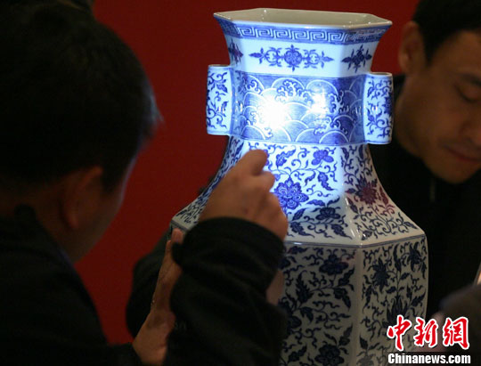 12月4日至6日,北京匡时2010秋拍将在京开拍。图为观众在观赏拍品青花花卉纹六方贯耳瓶。中新社记者 苏丹 摄