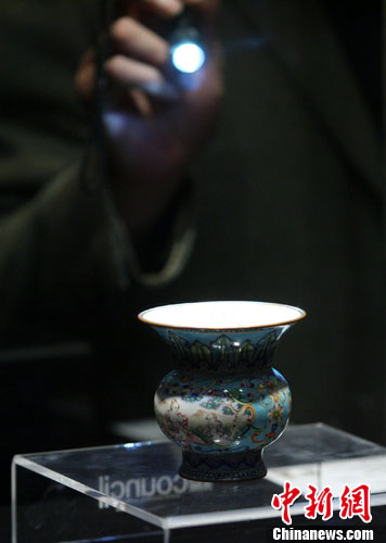 12月4日至6日,北京匡时2010秋拍将在京开拍。图为观众在观赏拍品铜胎画珐琅西洋人物渣斗。中新社记者 苏丹 摄