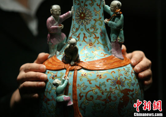 12月4日,2010匡时五周年秋季拍卖会在北京国际饭店会议中心拉开帷幕,在“清代宫廷艺术专场”中,清乾隆 松石绿地粉彩花卉纹五子登科敞口瓶以人民币1344万元成交。中新社记者 苏丹 摄