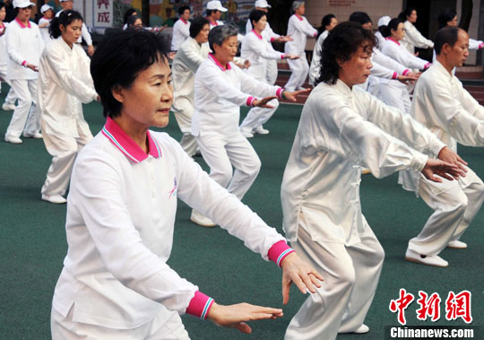 12月4日下午,参加海峡两岸柔力球、健身气功交流活动的台湾健身气功爱好者(红领)在福州健身气功爱好者的带领下习练健身气功六字诀。当日,海峡两岸柔力球、健身气功交流活动在福州群众路小学举行。来自台湾、福建福州、福建宁德、浙江的柔力球和健身气功爱好者相聚福州,互动交流、共叙情谊。中新社记者 刘可耕 摄