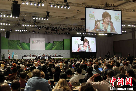 这次全会是本周坎昆大会的最后一次重要会议,因此吸引了众多的与会者,场面盛大。屏幕中人物为本届大会主席、墨西哥外长埃斯皮诺萨。