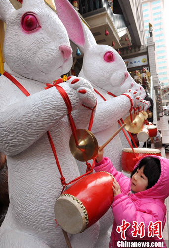12月5日,北京繁华街头布置迎贺新年的巨型兔年生肖其造型逼真可爱,吸引过往人目光。图为一位孩童正在饶有兴趣地敲击小鼓。随着农历兔年即将来到,迎贺新年的靓丽景致给北京城增添喜洋洋的气氛。中新社记者 张勤 摄