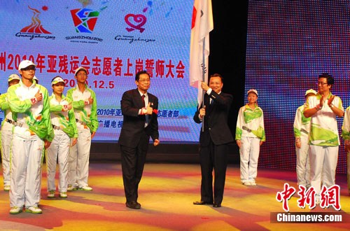 12月5日下午,“当好亚残东道主 志愿创造新生活”——亚残运会志愿者誓师大会在广州珠江新城举行。会上,亚运会、亚残运会志愿者进行志愿者旗帜交接仪式,标志着亚运志愿服务正式转入“亚残运时间”。亚运志愿者形象大使钟南山、亚残运志愿者形象大使白岩松等出席。中新社发 程景伟 摄