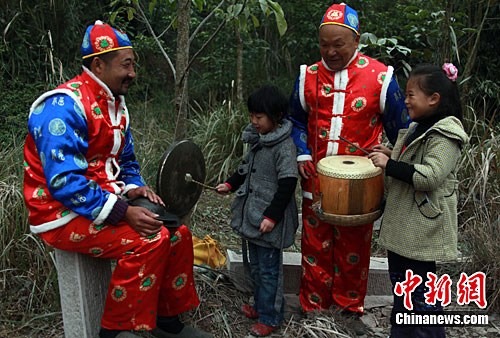 12月5日,重庆市非物质文化遗产保护项目“甘宁鼓乐”两位传承人刘明华(执鼓)、何川身着传统奏乐服饰,在万州青龙瀑景区路边切磋、交流,两名孩子也凑上前去试试锣鼓。据悉,“甘宁鼓乐”始创于三国名将甘宁的故乡,至今已有1800多年历史,被誉为一部活的“巴渝史”,目前正在申报国家级非遗保护项目。中新社记者 孙自法 摄