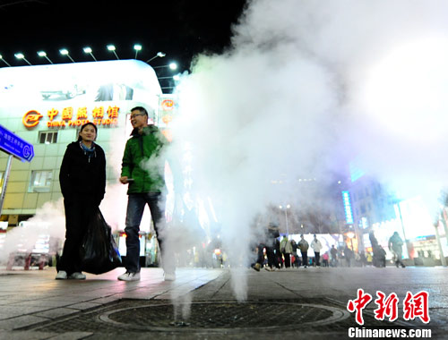 12月6日晚间,一对年轻人走过冒着蒸气的北京王府井大街。据报道,未来两天华北、黄淮、江淮等地将陆续出现6-12摄氏度的降温。