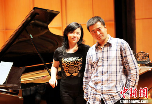 12月6日,大陆两名知名青年钢琴家陈萨(左)、王笑寒(右)携逾2架百年的厦门鼓浪屿古钢琴,在台北城市舞台奉献一场精彩的演出。图为陈萨、王笑寒在演出前记者会上合影。两位均在1980年出生的钢琴家都在国际上多次获奖。两架鼓浪屿钢琴博物馆古钢琴分别是1875年的史坦威与1937年的布鲁斯纳。