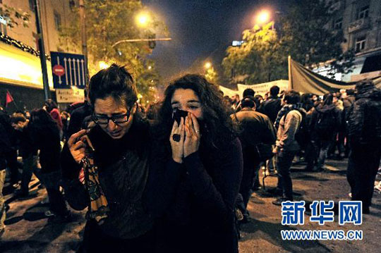 12月6日,两名女子在希腊雅典市中心参加集会。