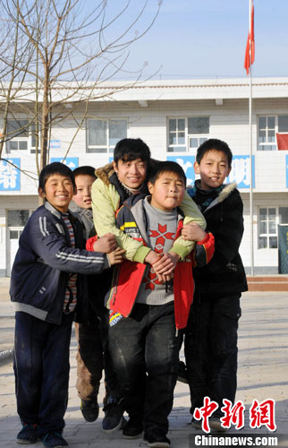 12月初,河北巨鹿县薄庄小学的四位男孩在护送残疾同学乔良川。乔良川是河北省巨鹿县薄庄小学的一名学生,因身患先天性脊柱裂,无法像正常人一样行走。看到他行动不便后,同班的胡晓威等四名同学主动担当起照顾他的重任。自2006年以来,四名男孩背着比自己高出一头、体重多20公斤的乔良川往返校园4年。中新社发 黄涛 摄