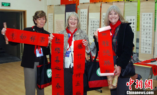 12月7日,来自美国中小学的代表手持福建福州钱塘小学小朋友赠送的中国传统对联,兴高采烈地展示给大家看。“汉语桥-美国中小学校长访华之旅”正在福建进行为期四天的参访活动。中新社发 张丽君 摄