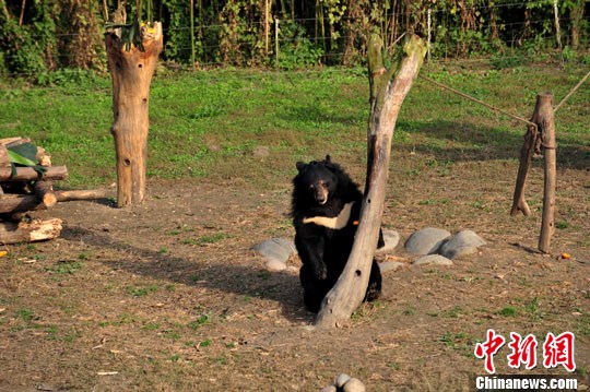 图为保护中心里的黑熊在玩耍。中新社发 安源 摄