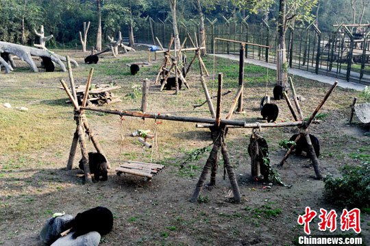 图为保护中心自得其乐的黑熊们。中新社发 安源 摄