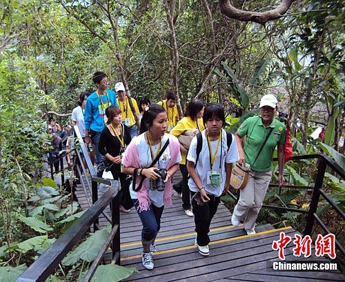 12月7日,来自文莱、马来西亚、新西兰、新加坡、泰国等国家的151名海外琼属青少年,在海南呀诺达文化旅游区参观。中新社发 张茜翼 摄