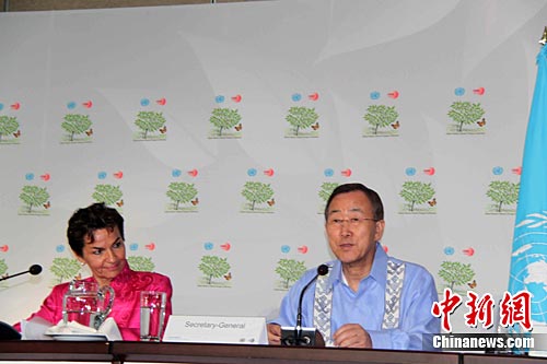 当地时间12月7日下午,联合国秘书长潘基文与《联合国气候变化框架公约》秘书处执行秘书克里斯蒂娜-菲格雷斯在坎昆气候变化大会高级别会议期间共同会见记者。中新社记者 李洋 摄