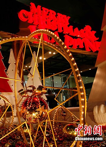 图为12月8日,昆明一商场门口的圣诞节装饰让寒冷的夜晚增添了些许暖意。中新社记者 刘冉阳 摄