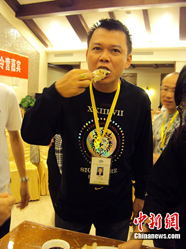 12月8日晚,参加第十一届世界海南青少年冬令营的来自文莱、马来西亚、新西兰、新加坡、泰国等国家的151名海外琼属青少年,在三亚市南山休闲会所开展包饺子比赛。图为来自马来西亚的琼属青少年抢着吃队友包的饺子。中新社发 张茜翼 摄