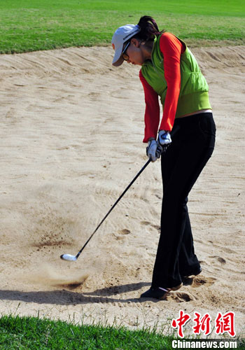 12月9日,惠州“金果湾杯”明星高尔夫邀请赛开杆,张嘉译、王奎荣、李鑫雨、石兰、谢东娜、黄格选等明星齐聚汤泉高尔夫球场挥杆休闲。图为名模谢东娜在打沙坑球。中新社记者 陈文 摄