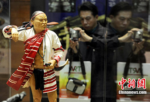 图为一位观众正在观看台湾原住民雕塑作品。中新社记者 刘震 摄