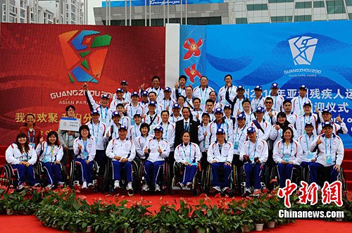 10日下午,广州亚运城升旗广场,前来参加升旗仪式的中华台北代表团在拍摄全家福。中新社记者 柯小军 摄