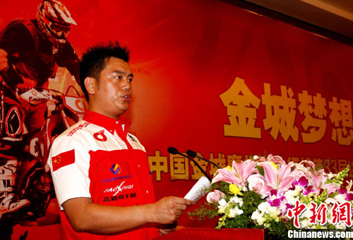 中国金城摩托车队征战第33届达喀尔拉力赛出征仪式12月11日在昆明举行,著名越野摩托车手苏文敏雄心勃勃力争取得更好成绩,为祖国争光。
