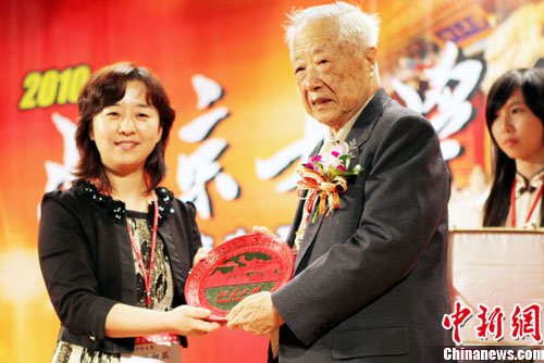 12月12日,北京大学百余位两岸校友在台北首度联谊。来自大陆各地和台湾的北大校友年龄从20几岁到100多岁,会场洋溢着北大特有的“精气神儿”。图为北大台湾校友总会会长张维桢(右)接受北大校友办公室致赠的纪念品。